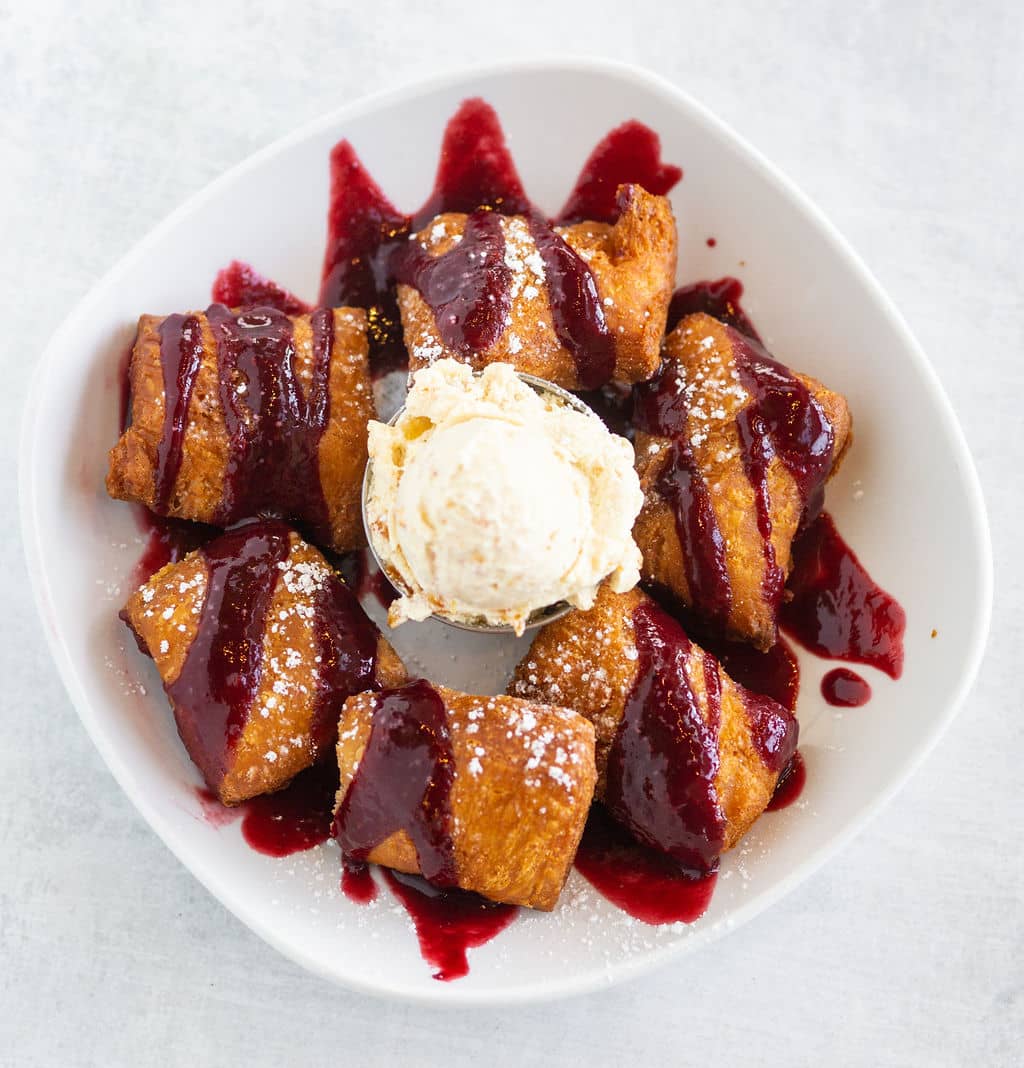 Beignets drizzled with raspberry melba, orange honey butter and topped with powdered sugar.