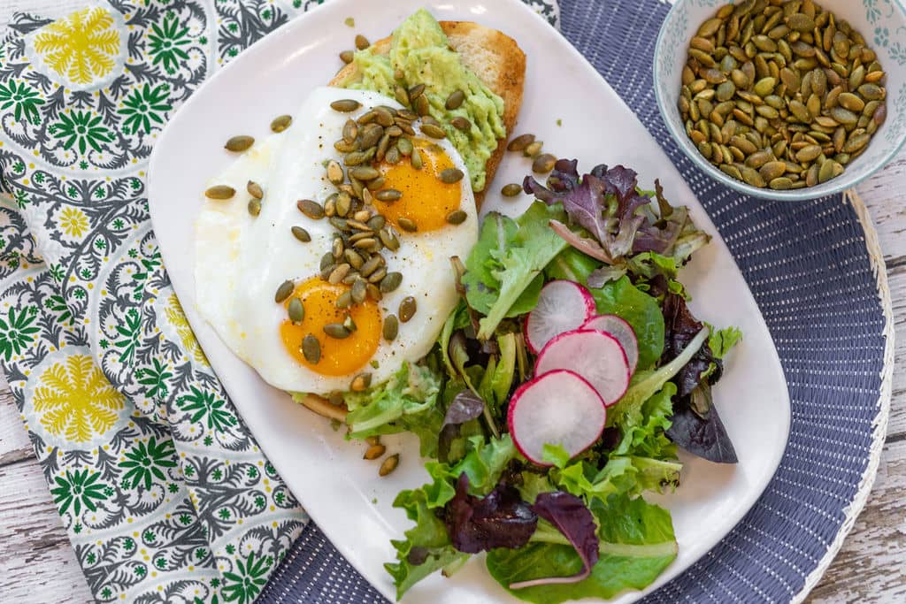 avocado spread, two sunny side eggs, lightly seasoned
