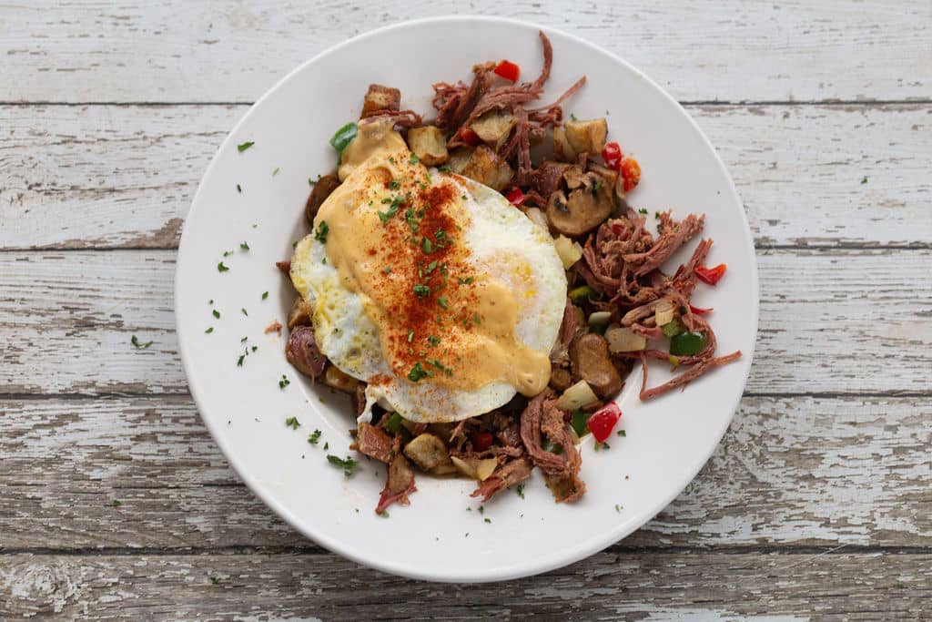 Cheesy, savory grits topped with sausage, bacon, ham, peppers, onions, two eggs, and garnished with parsley, served with a biscuit and your choice of spread.