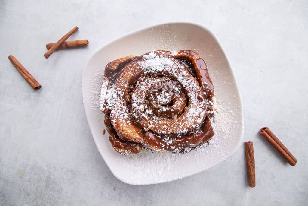 Handcrafted cinnamon roll topped with chocolate caramel and powdered sugar.